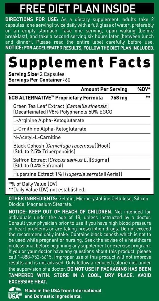 Directions: As a dietary supplement, adults take 2 capsules (one serving) twice daily with a full glass of water, preferably on an empty stomach. Take one serving, upon waking (before breakfast), and take a second serving six hours later (between lunch and dinner). Please read the entire label carefully before use. Diet plan included to help accelerate results.