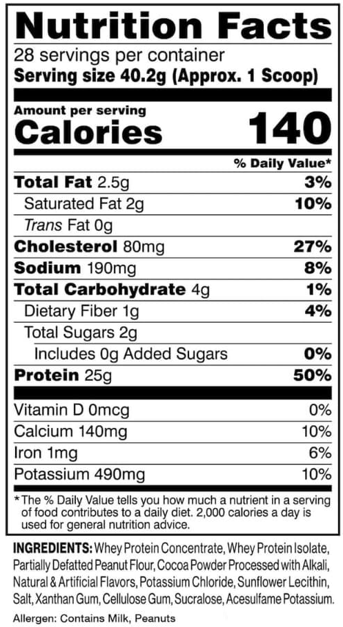 Whey protein concentrate, whey protein isolate, partially defatted peanut flour, cocoa powder processed with alkali, natural & artificial flavors, potassium chloride, sunflower lecithin, salt, xanthan gum, cellulose gum, sucralose, acesulfame potassium.