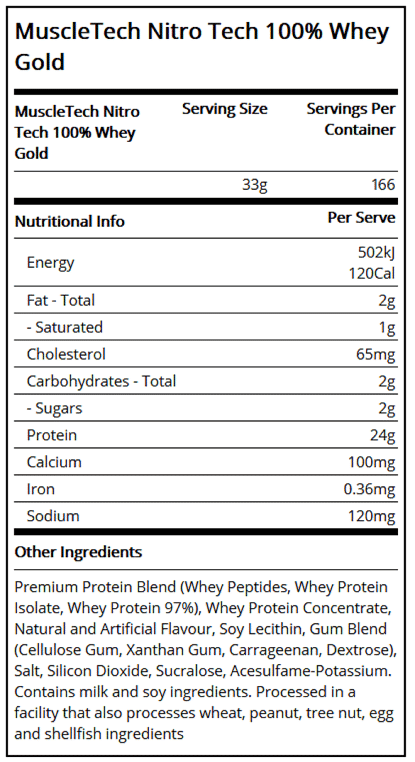 Introducing Muscletech Nitro Tech 100% Whey Gold – a pure protein formula featuring whey peptides and isolate! For over 20 years, NITRO-TECH® has been a leading protein brand. Built on a foundation of human research and cutting-edge science, it has earned the trust of countless consumers worldwide. Now the same research and development team has pioneered a new formula based on superior protein sources, quality and manufacturing.