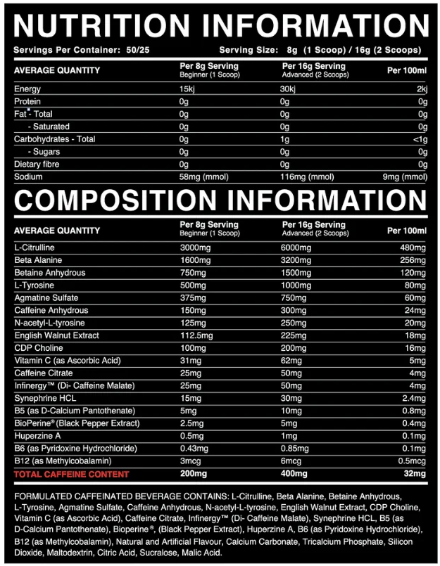 This formula features clinically dosed L-Citrulline and Beta-Alanine to support nitric oxide synthesis and lactic acid buffering, which may reduce muscle fatigue. A tri-source caffeine system combines fast-acting Caffeine Anhydrous with Caffeine Citrate and Di-Caffeine Malate for both an immediate kick and sustained focus. While other ingredients promote cognition, mental clarity and natural antioxidant support. Bioperine and B vitamins aid normal nutrient uptake and contribute to energy metabolism