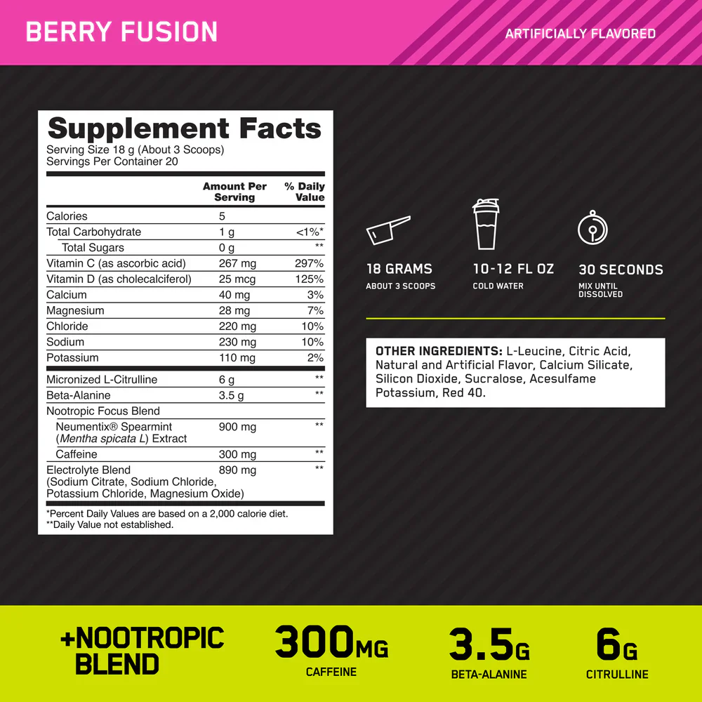 Optimum Nutrition Amped Pre-Workout is a high-stim pre-workout designed to support energy, focus, and endurance during demanding training sessions. Built for performance athletes and serious lifters, it combines powerful ingredients like caffeine, L-Citrulline, beta-alanine, and electrolytes to help fuel intense workouts and maintain peak physical and mental performance.