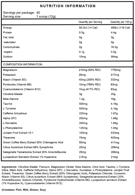 A sophisticated energy matrix featuring 225mg of Caffeine Anhydrous, Theacrine, and Green Coffee Berry Extract. This combination provides a clean, hard-hitting energy rush that sustains you through your workout without the jitters or the dreaded post-workout crash.